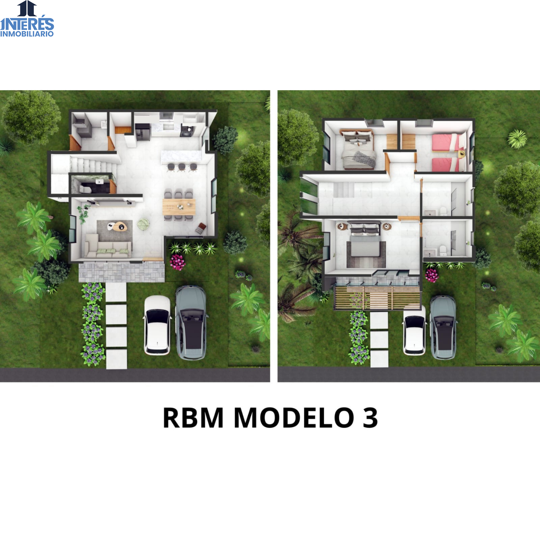 Modelo 3: casa de dos niveles, con área social en el primer nivel y habitaciones en el segundo, logrando una separación ideal entre descanso y vida familiar. Diseño contemporáneo y mayor metraje.